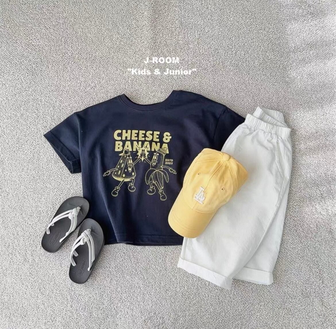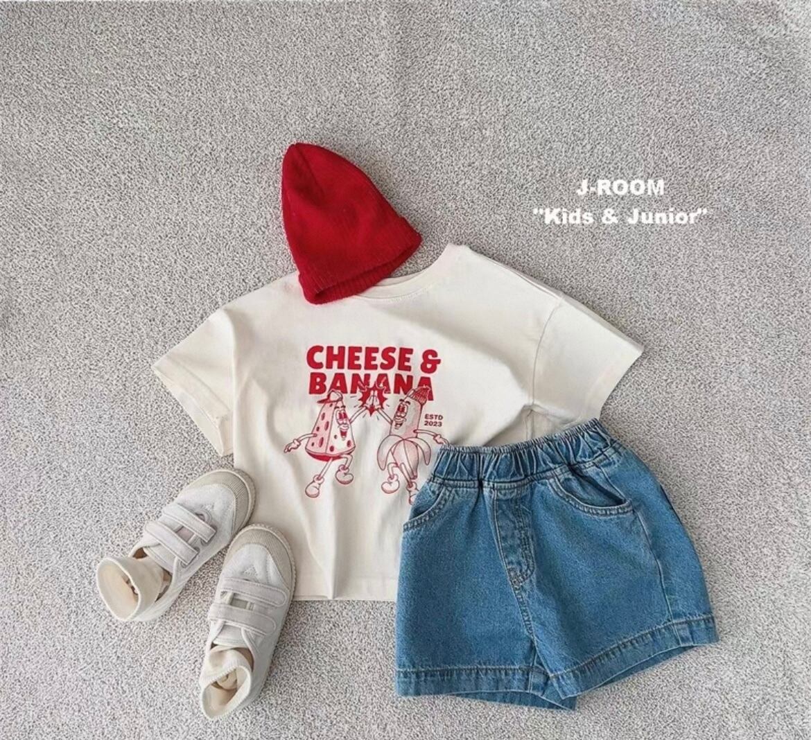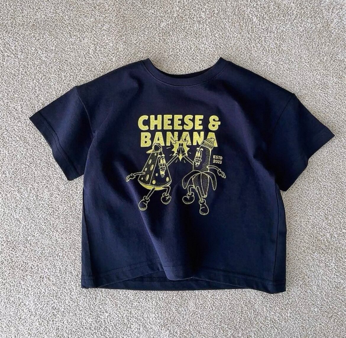 チーズとバナナのデザインが特徴的で、カジュアルながらも個性的なスタイルを演出します。柔らかな素材感が心地よい着用感を提供し、デイリーコーディネートはもちろん、お友達との遊びや特別なお出かけにも最適なアイテムです!